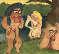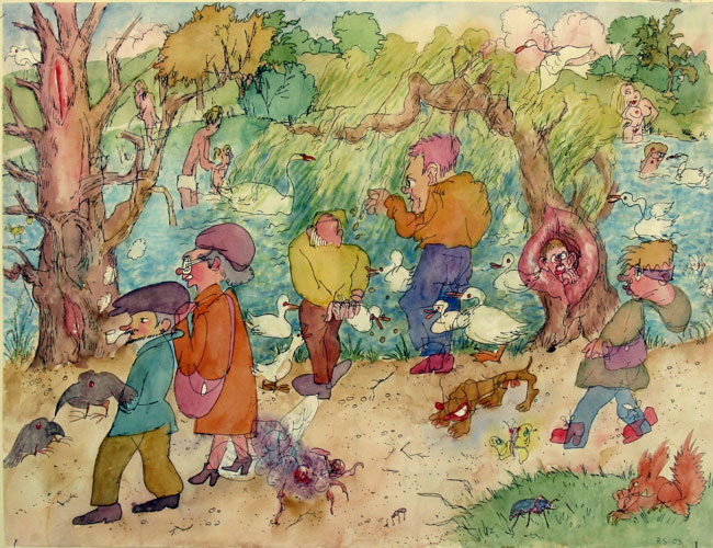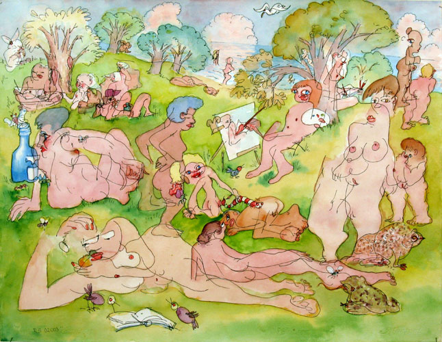 CLICK ON IMAGE TO ENLARGE Blindgezeichnete Tuschezeichnungen und Aquarelle 2003 Blinddrawing means: I draw with my eyes closed, mostly a simple outline-drawing and, in a second step, give it some interpretation with colours, this with the eyes open again. |